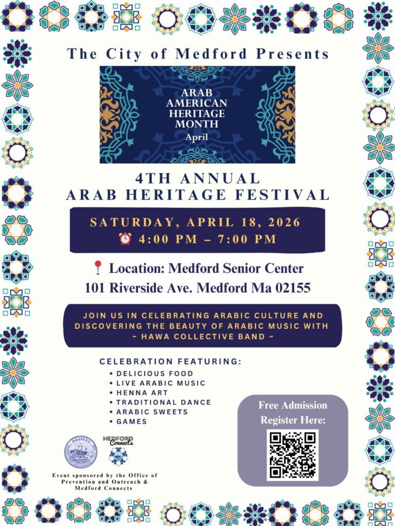 The annual Arab Heritage Festival is Saturday, April 18 from 4pm-7pm at the Medford Senior Center.