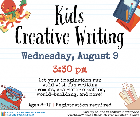 The Medford Public Library presents a Kids Creative Writing for those age 8 to 12. Let your imagination run wild with fun writing prompts, character creation, world-building, and more. Registration is required through the library’s online calendar.
