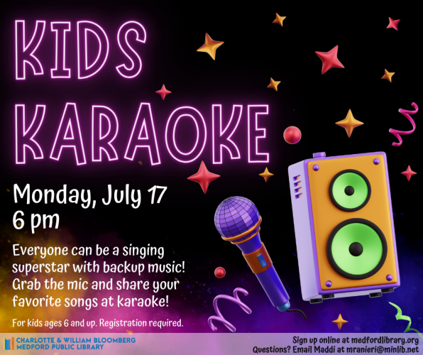The Medford Public Library invites kids ages 6 to 12 to take the stage and sing your heart out to Disney faves, Broadway classics, and more at Kids Karaoke night. Everyone can feel like a star with the right backup music. Parents and caregivers are welcome to attend as supportive audience members. Registration is required through the library’s online calendar.