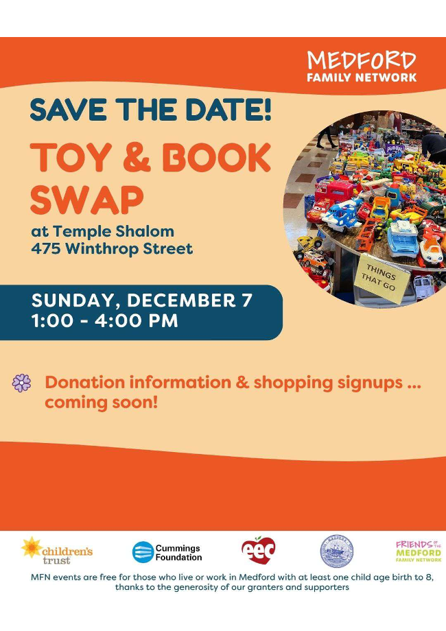 « All Events Toy & Book Swap Sunday, December 7 @ 1:00 pm - 4:00 pm « Aimee Mann & Ted Leo Christmas Show Gentle Yoga for Seniors » Donation Information & Shopping Signups Coming Soon! Add to calendar Google Calendar iCalendar Outlook 365 Outlook Live Details Date: Sunday, December 7 Time: 1:00 pm - 4:00 pm Event Category: Other Event Tags:family, holiday, mfn, ts, winter Website: https://www.mps02155.org/students-families/medford-family-network Organizer Medford Family Network Venue Temple Shalom 475 Winthrop St. Medford, MA 02155 United States + Google Map Related Events NaNoWriMo Writing Jam Monday, November 10 @ 6:00 pm - 8:30 pm Family Story Time at the Medford Public Library Wednesday, November 12 @ 3:00 pm - 4:00 pm Medford Family Network Mom’s Night Out Thursday, November 13 @ 7:00 pm - 9:00 pm